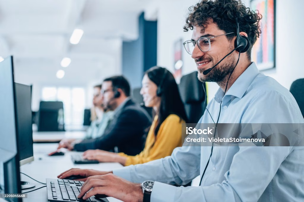 Smiling male call center agent wearing a headset types on a keyboard while working at a computer in a busy office with diverse colleagues assisting customers